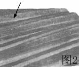 圖3中齒輪因為潤滑油不足在重壓力下造成金屬與金屬直接接觸而產(chǎn)生刻傷。磨損表面上的水平線是節(jié)線(箭頭所示)。
