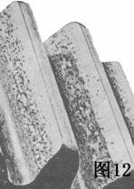 圖11中的麻點在螺旋面的外端(此圖中齒輪的右邊)開始,原因是中心線稍有失調(diào),麻點慢慢地向齒的中部進(jìn)展最后停止進(jìn)展,表面開始拋光,表示載荷沿齒面分配變得更均勻了.這種麻點是無害的。