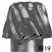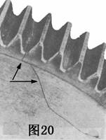圖20是一個從齒根圓角伸展到齒輪中心孔的疲勞裂紋,需要金相的檢查以確定造成缺陷的起因。