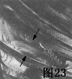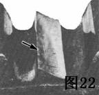 圖22是另一疲勞斷折的情況。箭頭指明裂紋在斷折處左邊緣開始,那里有一個小坑,靠近齒受壓側(cè)嚙合區(qū)的底部。緊靠裂源(箭頭指處)旁的地區(qū)受到充分的磨擦,說明裂紋起初發(fā)展緩慢。