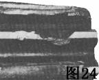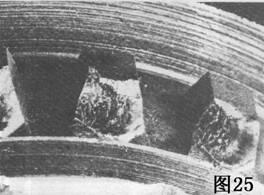 圖24中行星齒輪的大部分齒頂已碎掉。作業(yè)載荷產(chǎn)生的應(yīng)力在這個點引起裂紋。最后,可能是由于疲勞,這些裂紋繼續(xù)發(fā)展,直到齒的表面。如果這是在短的使用之后發(fā)生的,可能表面硬化深度過大,需要作金相檢查來作出判斷。