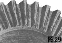 圖28所示硬化齒輪起棱可能是由于超載荷造成的。